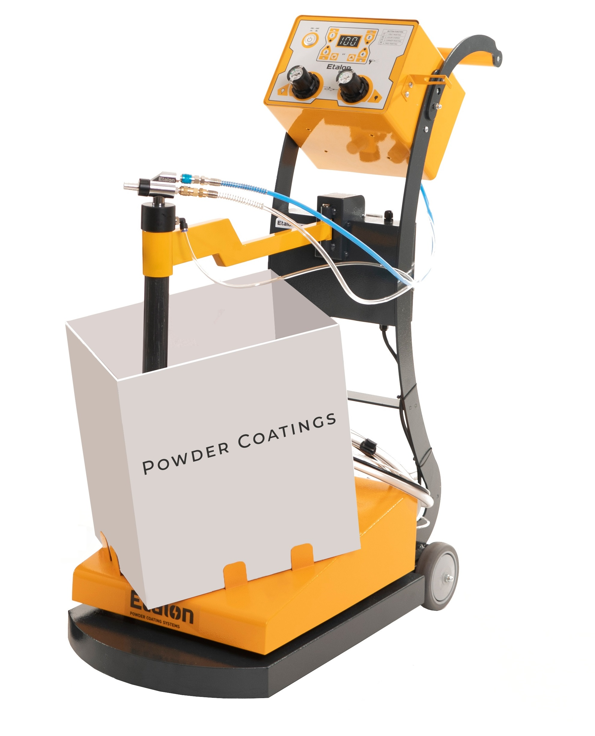 Ручные установки порошкового напыления Etalon предназначена для профессионального и повседневного использования. Установки порошкового напыления Etalon предлагаются в различных вариантах конфигурации для удобства эксплуатации. Установка может быть оборудована вибрационным столом для забора порошка непосредственно из коробки или баком с псевдосжижением разного объема 2,5,8, и 50 литров.