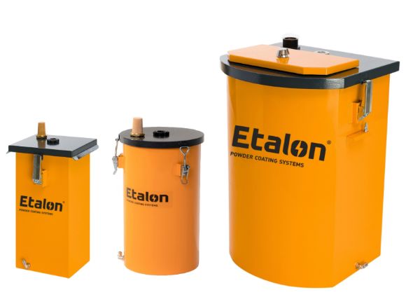Etalon В400 с баком- максимальная производительность. Преимуществом баков считается, что в псевдоожиженном слое частицы порошка лучше перемешиваются и удерживается во взвешенном состоянии, благодаря потоку воздуха, направленному против силы тяжести и легко транспортируются на пистолет-распылитель. В свою очередь, перемещение порошковой смеси к распылителю, обеспечивается через антистатический порошковый шланг, с двойной углеродной полосой. Бак для порошковой краски устанавливается на платформу в основании тележки установки.